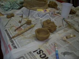 Csak agyagot, meg sokféle formázó szerszámot, a “hivatalos” keramikus eszközöktől a fogpiszkálóig. Ha a fantázia adott, úgyis bármiből szerszámot tudunk varázsolni. A cél minden eszközt szentesít, az agyag meg (majdnem) mindenről lemosható. 😀