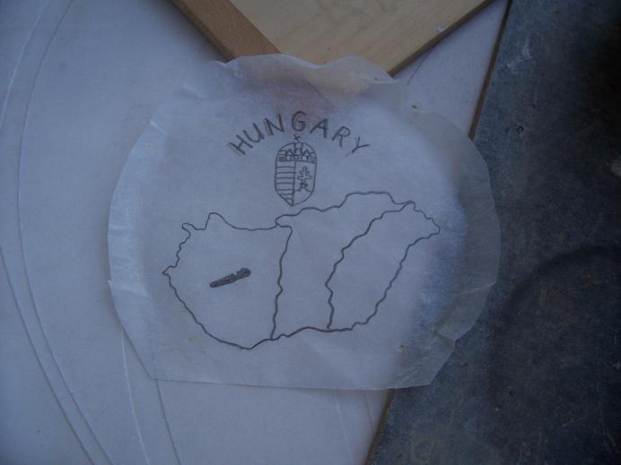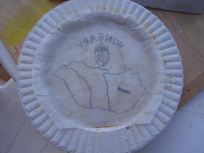 6. A forma belsejére helyezem az arccal lefelé fordított mintaképet, és enyhén átsatírozom valami tompa szerszámmal, hogy ne karcoljam fel a gipszet. Na ezért fontos a jól kenődő puha ceruza , hogy kis nyomásnál is átrajzolódjon a gipszre a lenyomat. Így már eleve tükrözve lesz a felirat és az ábra, és pontos lesz, nem hibázhatunk, mintha egyből a gipszbe próbálnánk karcolni a fordított mintát.