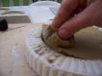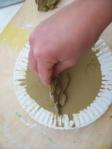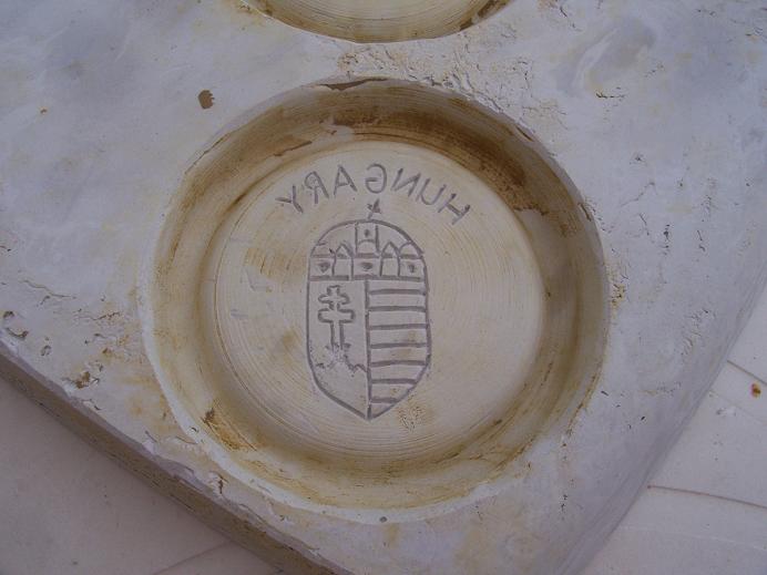 5. A megkötött formát kiemeljük a dobozból, és kicsi agyagdarab rányomogatásával( a pereménél ) kiszuszakoljuk belőle az agyagot. Csak akkor fog menni, ha már az agyag is szikkadt egy kicsit, én általában másnap szedem ki a gipszből.