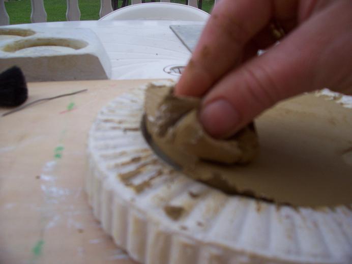 8. Elvileg kész is. Agyagot nyomkodunk bele, a felesleget valamivel lehúzzuk, pl. vonalzóval, és agyagdarabka segítségével kiszedjük. Célszerű először tisztára varázsolni a formát, kisebb agyaggombócok bele-bele nyomkodásával, így ki tudjuk szedni a gipszmorzsákat, tiszta lesz a kész plakett. A széleket, egyenetlenségeket persze szivaccsal le kell tisztázni.