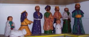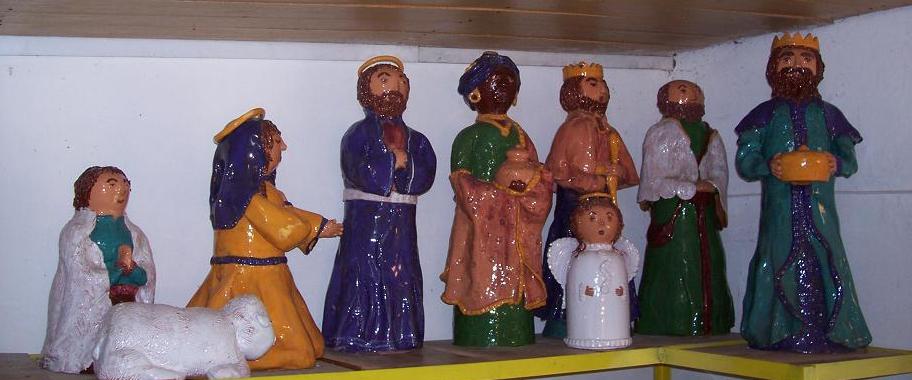 1997-ben készítettem, 60-70 cm magas szobrokból áll, 11 darab figura alkotja. A nagy alakok méretük miatt több kisebb korongozott hengerből vannak felépítve, kézzel formáztam rájuk a végtagokat, ruhát, díszeket. Zsengélő égetés után kézzel festettem ki mindegyiket, a festésre színtelen átlátszó mázat vittem fel, majd azzal újra égettem őket. Monumentális munka volt, tél közepén, reggeltől beájulásig, sok-sok kemencerakással, hiszen egyszerre maximum két szereplő fért be a kemencémbe.