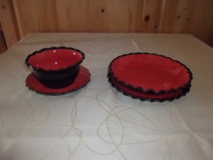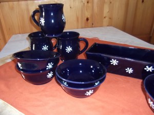 Aztán vettem egy gyönyörű sötétkék mázat, ami annyira hihetetlen árnyalat, hogy lehetetlen fotózni. A mélykék kifejezésnek szinte érezni a mélységét. Azért megpróbáltam fényképezni, reggelizőszetten, kenyérsütő formával kiegészítve: