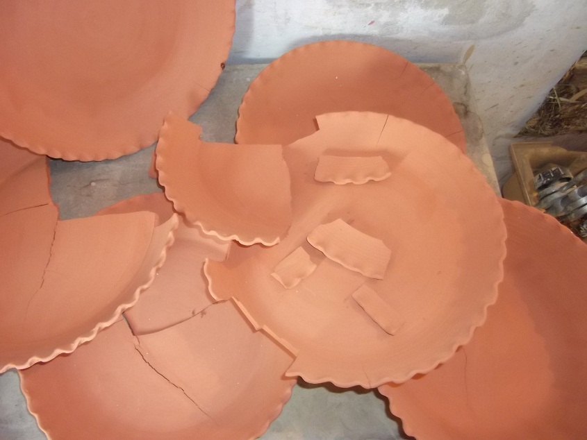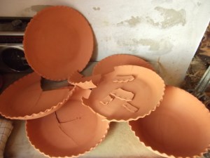 Ezek kb. 30 cm átmérőjű tálak voltak, mind korongolt. Babusgattam őket két hétig, mert általában a nagy lapos felületek hajlamosak selejteződni, sokszor már száradás közben elrepednek. Ide-oda rakosgattam szerencsétleneket, hogy megfelelő hőmérsékleten száradjanak szépen lassan, de hiába.