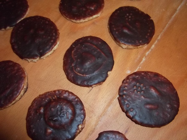 Aztán eszembe jutott, hogy ugye múltkor is már be akartam mázazni őket. Mármint kekszeket, elnézést a szakmai áthallásért. 🙂 Ja és csokival, természetesen. Nem is lett rossz, bár még nem tökéletes: vaj helyett pici olajjal fényesebb lenne, és ahhoz, hogy a nyomott minták szépen átüssenek a csokin, elég hígra kell komponálni a mázat. Kevés vízzel hígítottam, belemártottam, és az utolsó darabnál rájöttem, hogy finoman ecsettel rákenve is jól mutat.