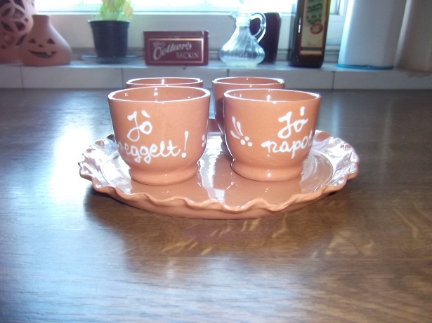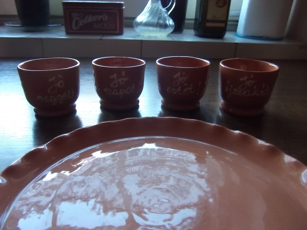 Aztán volt pálinkás kupica készlet kis tálcával, minden napszaknak egy-egy megfelelő feliratos kupica, nehogy elfelejtsük, hogy hol is tartottunk. 🙂