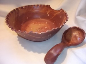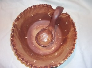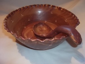 Ha már itt tartunk, bemutatok egy tálat Zsákos Frodó asztaláról is. 🙂 Ez egy nagyméretű tál kanállal, tálaláshoz, puncshoz, berki galuskához….bár ez utóbbi desszert inkább itt a Nagyberek táján őshonos, nem a Megyében, noha szerintem simán hobbitokhoz is illő eledel.