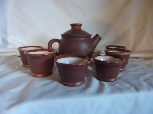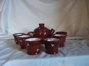Érdekes, hogy ugyanez a kanna kicsit más poharakkal, effekt és fehér máz kombinációjával keleties hatást ad, ez itt egy teáskészlet ázsiai módra:
