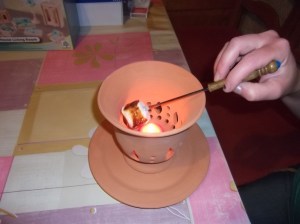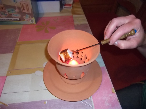 Még fejlesztés alatt, de kiválóan működik, kellemesen pirít, és még hangulatosan világít is. Teamécsesnél nagyobb gyertya kell bele, az alátét egy külön tányérka, a felső része pedig pont olyan magas, hogy biztonságosan lehessen gyertyázni. Felfelé-kifelé bővülő peremmel, így egy kis fondü-villán kényelmesen lehet felette forgatni a cukrot.