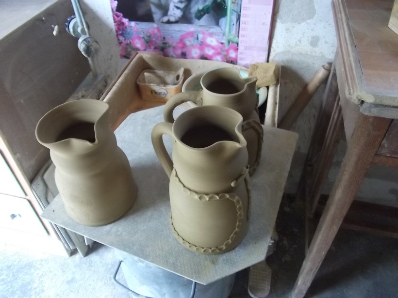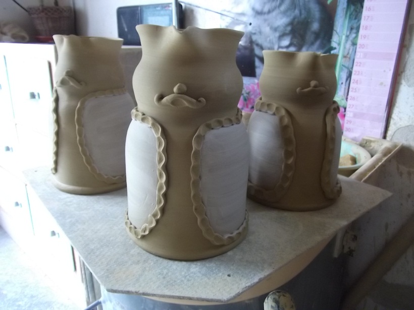 2. Na szóval hagytuk kicsit száradni a korongolt kancsóalapot, majd amikor bőrkemény lett (ujjal nem, csak körömmel nyomható be) fület tapasztunk rá, orrot és bajuszt illesztünk a képére. A subája szegélyét is ilyenkor ragasztom fel, minden egyes bemélyedést kézzel nyomkodva bele.