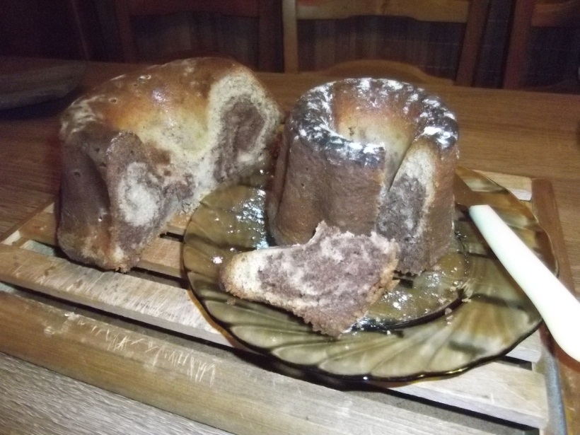 Receptre most nem térnék ki, véletlenszerűen választottam egyet, ez egy élesztő nélküli márványos kuglóf recept volt valamelyik retro szakácskönyvemből. Bármilyen más kuglófrecepttel működik, csak most gyors eredményt akartam, nem volt türelmem megvárni amíg az élesztős megkel. 🙂
