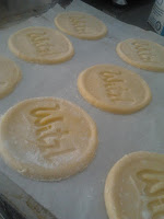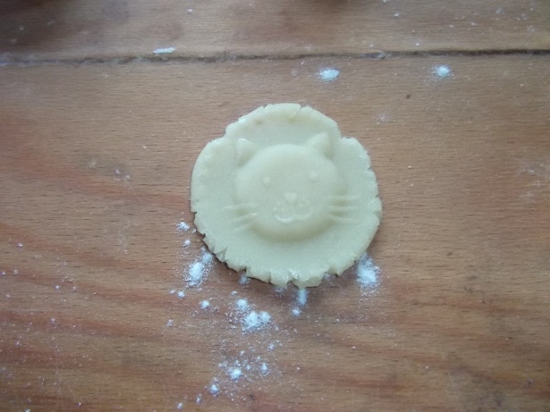 Mi először kisodorjuk lappá a tésztát, aztán pogácsaszaggatóval korongokat szaggatunk, majd megnyomdázzuk őket. De lehet úgy is, hogy kb. diónyi gombócokat formázunk, és azokat lapítjuk le a pecséttel; vagy az egész tésztát hengerré sodorjuk, egyforma vastag korongokat vágunk le késsel belőle, és azt mintázzuk.