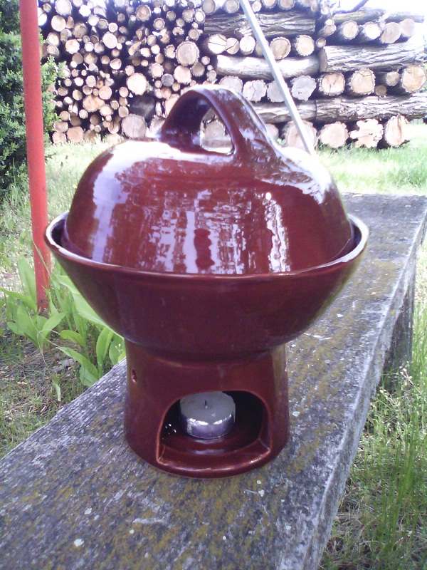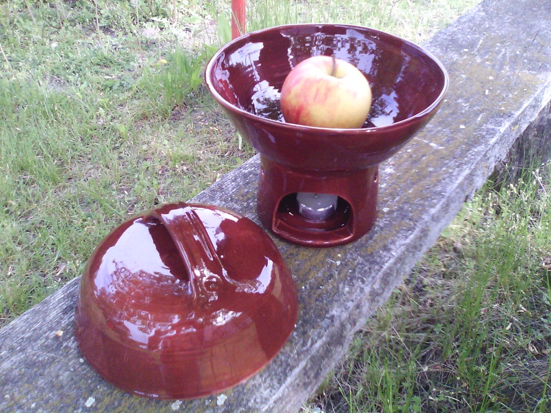 A mai utolsó “csemege” azért érdekes, mert azon kívül, hogy nem tartozik a fent említett magyaros vonalba, eddig valahogy nem is jutott eszembe hasonlót készíteni. Ez ugyanis egy almasütő. Gondoltam olyat sokan készítenek, és nagyon szépeket is, meg a sült alma nem is az én világom, szóval valahogy kimaradt. Aztán egy kétségbeesett külföldi hölggyel találkoztam, aki annyira szereti a sült almát, hogy neki túl kicsi az átlagos almasütő, és sehol a világon nem kapott nagyobbat. Hát most már van neki. 🙂 Igaz, méretre már megközelít egy kisebb levesestálat az űrtartalma, de sebaj, így még családi fondüzésre is alkalmas. A képen a belehelyezett alma ne tévesszen meg senkit, az egy gigantikus, majdnem félkilós jószág volt, a hölgytől kaptam modellnek. Tulajdonképpen köré kreáltam az edényt…