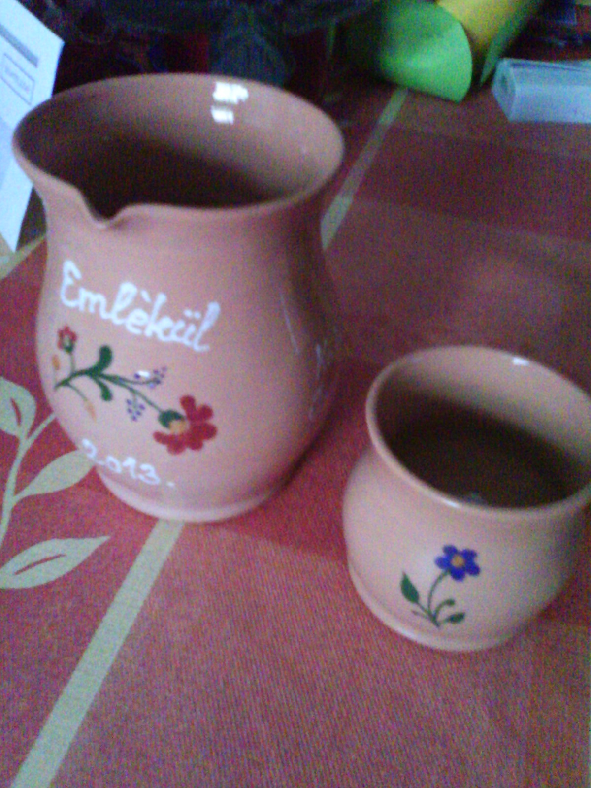 Na de elkanyarodtam a magyaros vonaltól, a következő kicsit magyaros lesz, és kicsit retro. Nem is annyira a minta miatt retro, hanem mert kapott egy “Emlékül” feliratot. Gyerekkoromban dédikém kredencén sorakoztak ilyen darabok, és hasonlót festeni olyan volt, mintha megint ott ültem volna egy kicsit a süti-illatú nyárikonyhában. 🙂