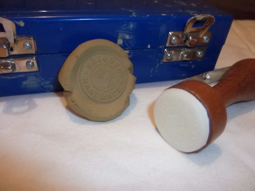 Aztán megszállt az ihlet, és a véletlen éppen a megfelelő szakemberekkel hozott össze virtuálisan. És az eredmény: készíttettem egyedi logós bélyegzőt papírra/dobozra/csomagolásra/fára meg ami még eszembe jut; és egy egyedi szignós pecsétet, amivel egy mozdulattal megoldom a friss kerámiák aláírását, úgy hogy a kézműves készítési mód is meg van jelölve. Ezt azért gipszből kifaragni saját kezűleg kicsit problémás lett volna. A legjobb az volt az egészben, hogy ezért ki sem kellett mozdulnom itthonról, az egész procedúra a neten lebonyolódott, a postás pedig jól idehozta nekem. 🙂 A kivitelezés a Betű-mix Kft. munkáját dícséri, itt lehet őket elérni:https://betumix.hu/