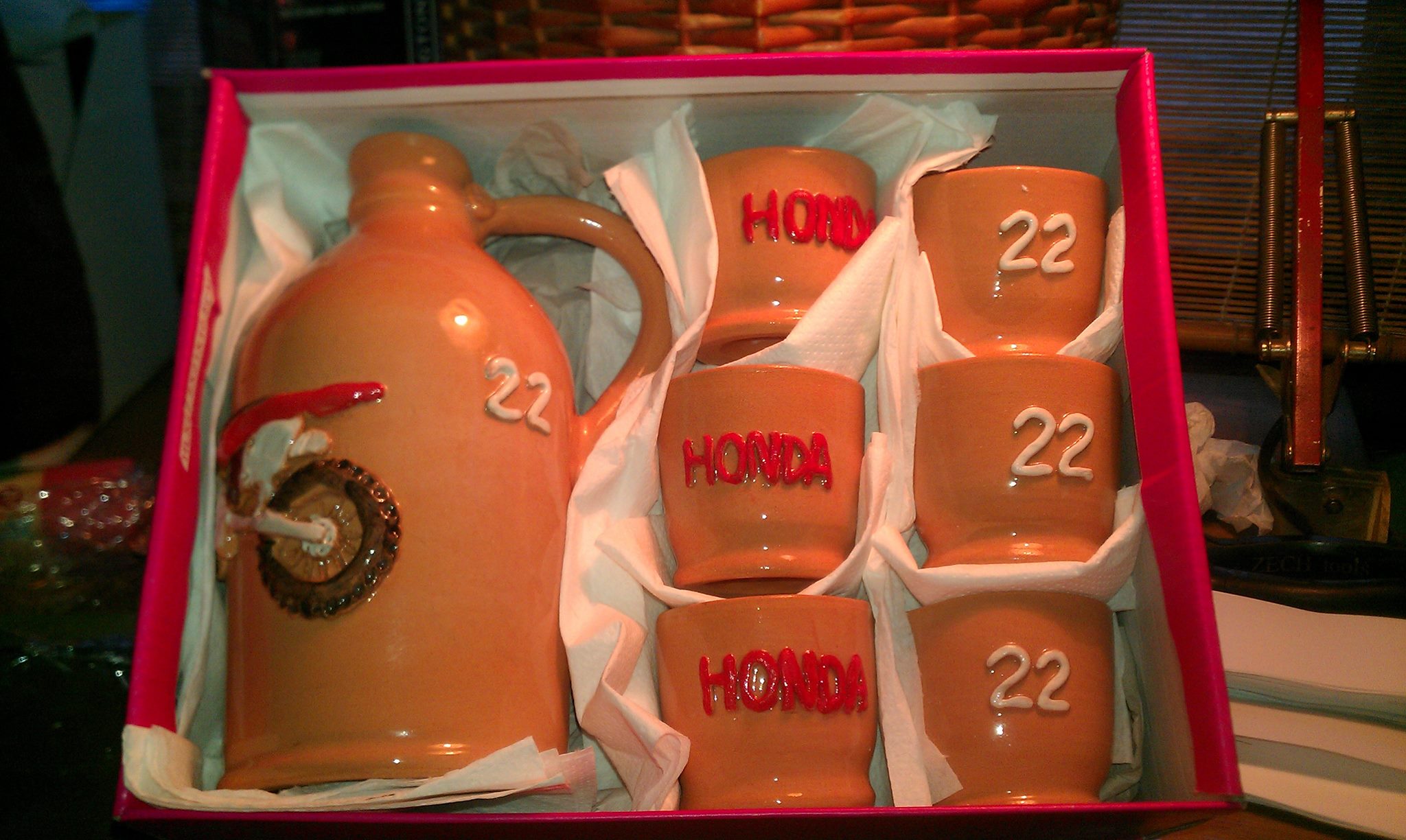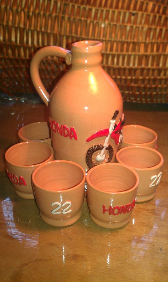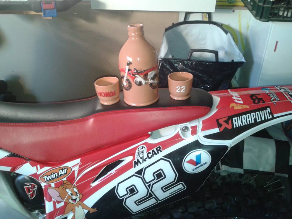 Nagyon jó példa erre kedves ismerősünk, Tóth András megrendelése, aki motoros témájú ajándékot szeretett volna készíttetni egy jeles alkalomra. Na itt már felcsillant a szemem, amikor a “motorozás” varázsszó elhangzott. (kiszaladtam leporolni a bukósisakom 🙂 ) Bevillantak a régi Pannóniás motorozások, a motorostalálkozók és börzék hangulata, és már meg is volt az ötlet. Ami az ajándékozandó kerámia napi használhatóságát illeti, itt csak az volt a kérdés, milyen jellegű edényt használ gyakran az illető….