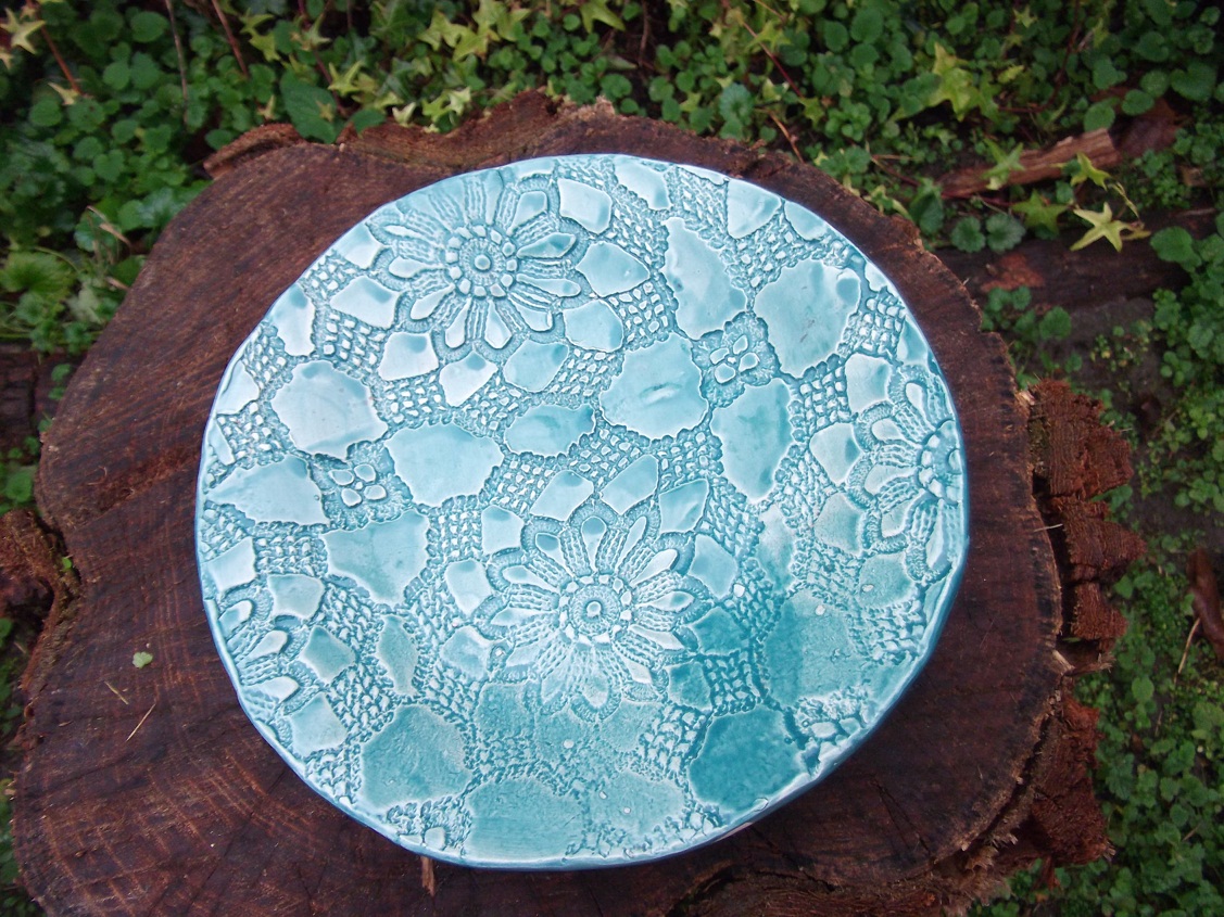 ….avagy két különböző kézműves alkotás egy darabban. Gondolom nem én találtam fel a csipketerítő-lenyomatos kerámiát, de én most csináltam először, és nagyon tetszett. 🙂
