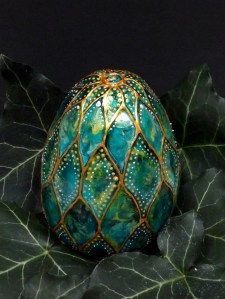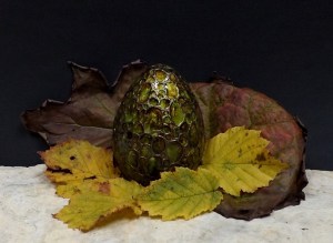 Sárkánytojások. Én korongoltam őket, fehérre mázaztam, égettem, Mina pedig üvegfestékkel varázsolta őket igazi sárkánytojássá. Tulajdonképpen általa keltek életre, addig csak egyszerű fehér tojások voltak. De most már ki tudja mi kel ki belőlük…… 🙂