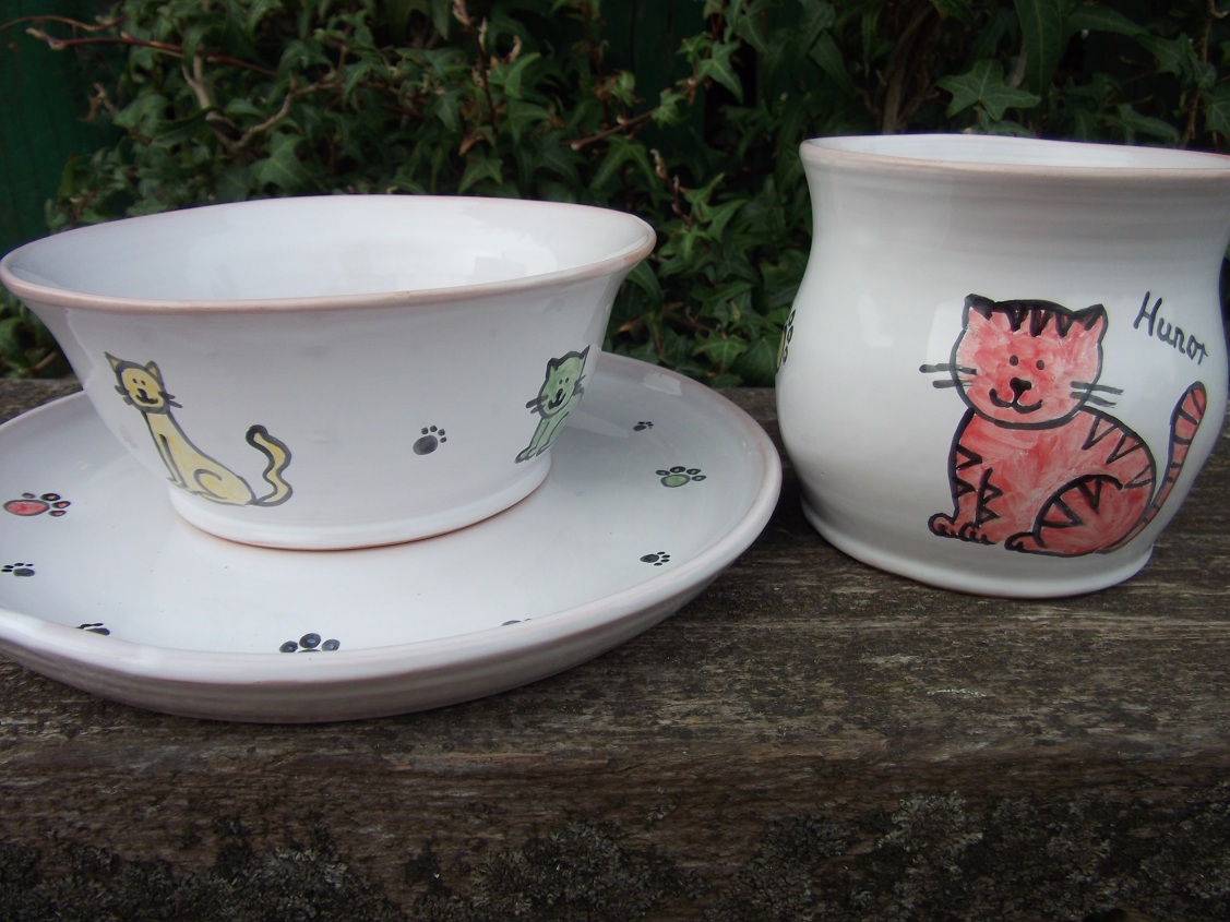 Aztán nemrég felfedeztem egy új mázfajtát, ami vízbázisú, ecsettel is könnyen felvihető, nem kell hozzá oldószer, nyers mázra is festhetek vele, akár alá, akár fölé, sőt még a színek is keverhetők. Ja és persze nem mellékesen élénk színűek, és a végeredmény velük majdnem ugyanolyan, mint a pár évvel ezelőtti színes festett állatfigurás kerámiáimon. Azért majdnem, mert igazából sokkal szebb. 🙂 Mivel ez is egyfajta máz tulajdonképpen, szépen beolvad 960 fokon, a felülete gyönyörű fényes, és egyenletes, ez tényleg karcálló, hiszen nem egy plusz réteg van alacsonyabb hőfokon ráégetve, hanem egy tűzben ég, olvad össze az alapmázzal.