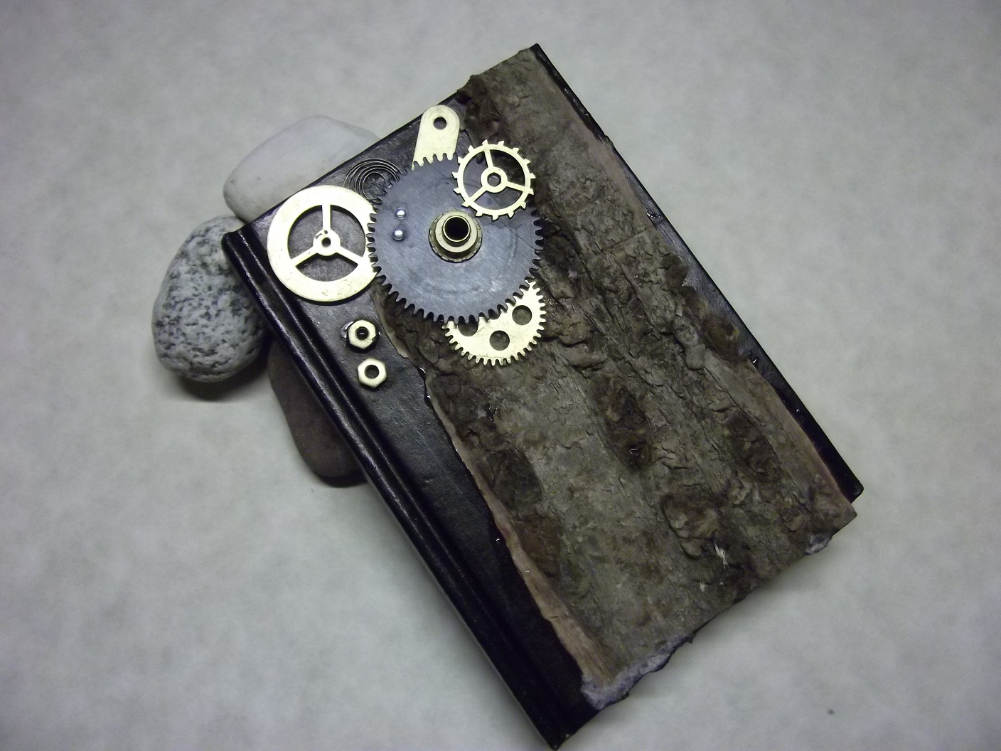 Mindig is érdekelt a steampunk, mint stílus, van valami különleges hangulata….Viszont valahogy eszembe sem jutott, hogy én is készítsek hasonló dolgokat. Aztán kezembe került egy régi működésképtelen ébresztőóra, és elindultak a fogaskerekek is az agyamban. (csak hogy stílusos legyek ugye 🙂 ) Azt mondjuk nem tudom megmagyarázni, hogy az első próbálkozásom miért egy noteszen ment végbe, feltételezem azért mert nem szeretek ragasztani, és a tudatalattim emiatt szép egyenes felületet választott. Ez volt az: