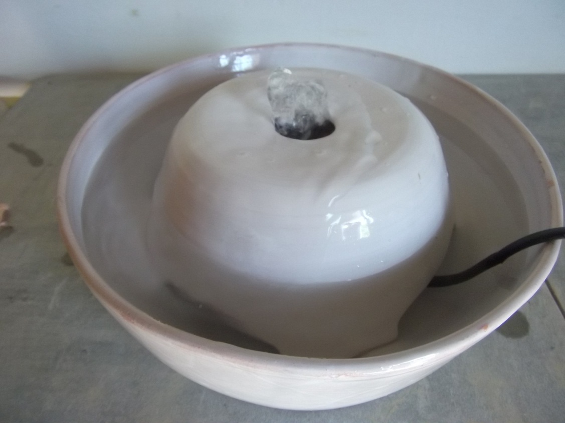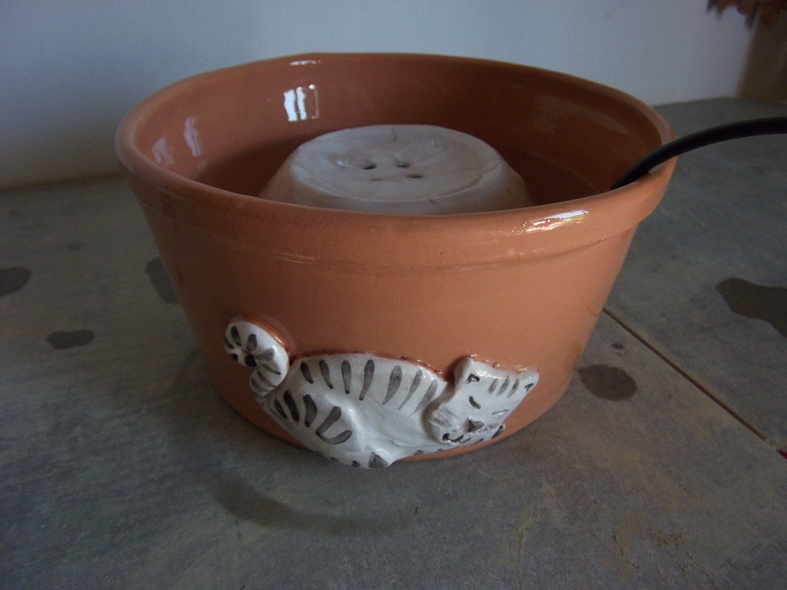 Bevallom, amikor megkaptam a megrendelést, első hallásra halvány segédfogalmam sem volt, milyen a cicaitató, ugyanis nekem egy elvetemült vidéki vagány tigrisem van, aki csak és kizárólag a kutyus vizes táljából hajlandó inni. (lehet hogy azért tartja a kutyát, hogy ellenőrizze neki a vízminőséget….) Persze gyorsan utánanéztem a dolognak, és kiművelődtem a kereskedelemben kapható kisállat ivókutakból. Hogy ezt kerámiából csináljam meg, arra azért volt szükség, mert a kerámia higiénikusabb a műanyagnál, elkerülhető így az esetleges fertőzésveszély.