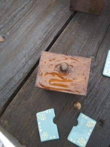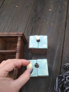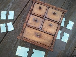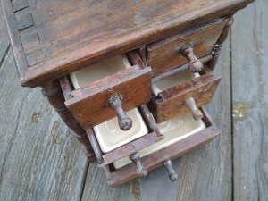 Szóval ettől megkíméltem a világot, inkább olyan kéréseket vállaltam el, amikor egy régi törött kerámiát kellett reprodukálni, vagy kopott gipsz szobrot festettem újra. Mindez azért elég távol áll a restaurátori munkától, csak mindig eszembe jut róluk az a régi gereblye. 😀 Nos, nemrég egy kedves megrendelőm kért meg arra, hogy egy régi fűszeres szekrénykét próbáljunk meg újra használhatóvá tenni úgy, hogy közben megőrizzük antik báját. Mivel ez egy fából készült fiókos tároló, én meg egy kicsit plasztikusabb munkakörben mozgok, nem nagyonn láttam a megoldást, hogy lehet a két anyagot összehozni. Aztán egyszer csak jött egy “flash” (a hirtelen megvilágosodás túl hosszú szó 🙂 ) és nini, megcsináltam! Leírva unalmas lenne, inkább megmutatom képeken: